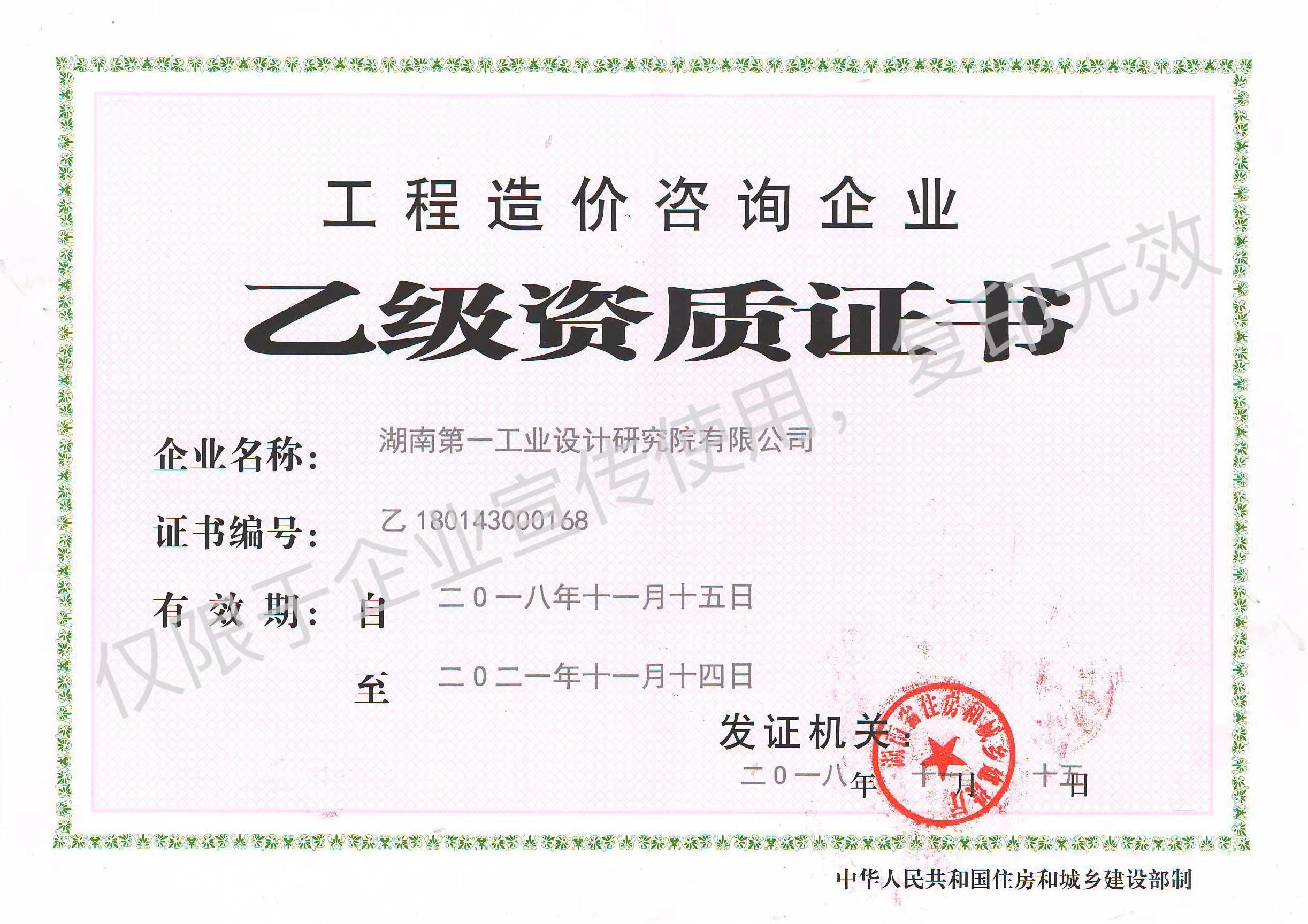 工程造價咨詢企業(yè)乙級資質證書